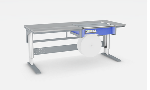 Elektrisch höhenverstellbarer Arbeitstisch mit Cyklop iQ400 Umreifer. Der Tisch ist aus lackiertem und korrosionsbeständigem Stahl mit einer schmutzabweisenden Oberflächeneigenschaft. Höhenverstellbar über die Tischbedieneinheit, Verfahrgeschwindigkeit 10 mm/sek ohne Belastung. Ausgestattet mit zwei Motoren und 230 V/50 Hz Anschluss. Die Füße sind verstellbar. Maximale Belastung 400 kg verteiltes Gewicht. Minimale Höhe 700 mm, maximale Höhe 1150 mm.