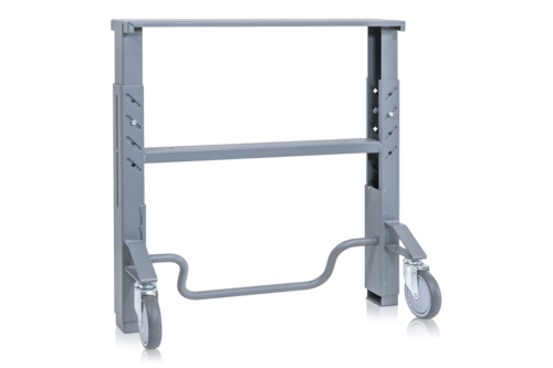 Der HD Beinrahmen mit Rollen kann einfach mit einem Bügel arretiert werden. Die Lenkrollen bestehen aus TPE-beschichteten Kunststoffrädern mit 125 mm Durchmesser.