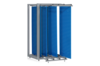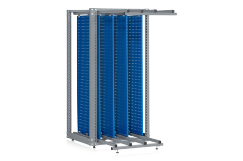 Kompaktes Werkzeuggestell mit einer Lastkapazität von 400 kg mit vier ausziehbarer Schiebewände mit Rollwagen. Für zusätzlichen Stauraum kann das Werkzeuggestell mit je drei weiteren Lochrasterplatten an den Außenseiten ergänzt werden.