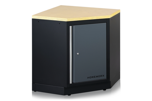 Unterschrank für Eckmodule, passend zu unserer übrigen Garageneinrichtung. Der Unterschrank verfügt über einen herausnehmbaren Einlegeboden, eine Deckplatte aus 38 mm starkem Sperrholz und eine abschließbare Tür mit zwei Schlüsseln. Die perfekte Ergänzung, um den Stauraum in der Garage zu erweitern und den Eckplatz optimal zu nutzen.