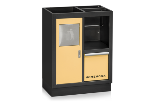 Unterschrank in Gelb-Beige mit Platz für Abfall- und Papierrolle. Perfekt kombinierbar mit anderen Schränken, Unterschränken und Arbeitsplatten für eine komplette Aufbewahrungslösung und Werkbank.