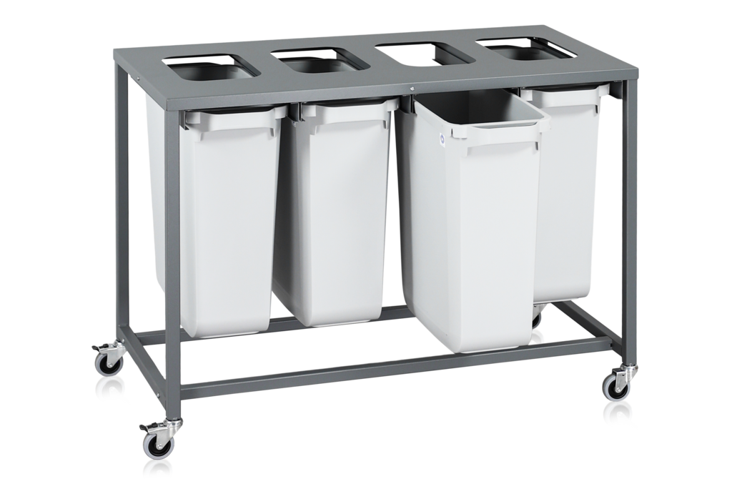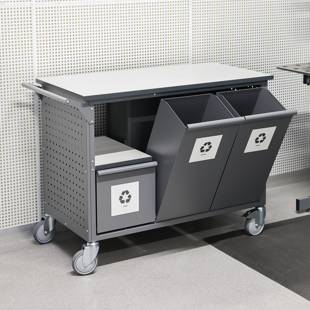 Variante Nummer zwei – ein vielseitiger Sortierwagen, der sich für die Sortierung verschiedener Materialien in vielen Bereichen eignet. Er besteht aus einer schlichten Rohrkonstruktion mit einer Deckplatte aus lackiertem Blech und ist mit vier Lenkrollen (75 mm) ausgestattet. Dank seines schlanken Designs und des geringen Gewichts ist er flexibel manövrierbar. Erhältlich in drei verschiedenen Varianten mit zwei, drei oder vier losen Behältern aus recyceltem Kunststoff mit jeweils 60 Litern Volumen und kann sowohl mit als auch ohne Müllbeutel verwendet werden. Ablösbare Aufkleber zur Befestigung an der Deckplatte oder den Behältern sind im Lieferumfang enthalten.