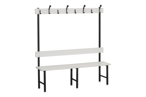 Stabile und freistehende Bank, die sich ideal für Umkleidekabinen oder Garderoben eignet. Bei dieser Variante handelt es sich um ein einzelnes Element mit zugehöriger Hakenleiste für die Möglichkeit zum Aufhängen. Die Bank verfügt über Bankbretter, Rückwand und Hakenleiste aus Melamin und einem schwarz lackierten Sockel. Die Bank hat eine Sitzhöhe von 430 mm und eine Sitztiefe von 365 mm, Gesamthöhe 1600 mm.