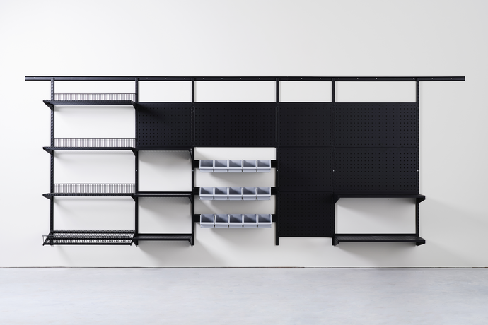 Die Wandaufbewahrung lässt sich ganz einfach aus den von Ihnen gewählten Teilen nach Bedarf zusammenbauen. Sie lässt sich daher bei Bedarf problemlos mit verschiedenen Abschnitten und Zubehör erweitern. Kaufen Sie Winkelregale, Lochplatten, Werkzeughaken oder warum nicht eine Leiste mit Kunststoffbehältern für kleine Aufbewahrungslösungen dazu? Klicken Sie auf „Play“ und begleiten Sie uns, wenn Joacim Rickling seine Wandaufbewahrung von Homeworx zusammenbaut!