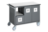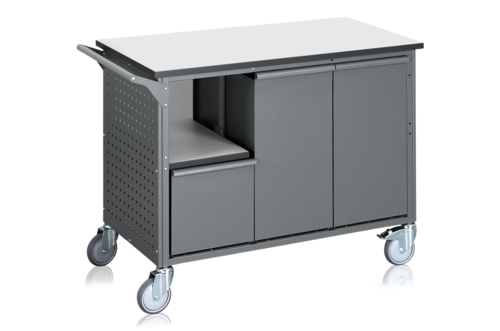 Robuster Abfallsortierwagen für die industrielle Abfallentsorgung. Ideal für Arbeitsplätze, die eine flexible Lösung für die Handhabung, Sortierung und Entleerung von Abfällen während des Arbeitstages suchen. Der Abfallsortierwagen ist mit sechs großen Behältern mit je 50 Litern Volumen ausgestattet. Die Behälter lassen sich zum Entleeren einfach abnehmen oder zusammen mit einem passenden 50-Liter-Müllsack verwenden. Der Wagen verfügt über robuste Räder (125 mm) für den Transport in den meisten Branchen und anspruchsvollen Umgebungen sowie über Lochwände an Vorder- und Rückseite zum Aufhängen von Zubehör wie Haken und Drahtkörben. Laminatplatte 1100 x 570 mm.