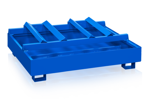 Auffangwanne für 2 liegende Fässer. Auffangkapazität von 310 l. Verhindert das Kontaminieren von Flächen mit umweltgefährdenden Flüssigkeiten durch Auffagen in der Wanne. Robuste Stahlblechkonstruktion, für maschinelle Handhabung geeignet. Die Auffangwanne ist pulverlackiert in blauer Farbe. Die Auffangwanne kann mit 150 mm Nylonrollen ausgerüstet werden.Spezifikation - Auffangwanne für 2 Fässer liegend