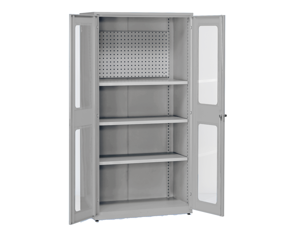 We are clearing out our warehouse and have the opportunity to offer two workshop cabinets to a profitable price. The workshop cabinets come in our old grey colour (RAL 7037) and are manufactured in a fully welded construction of sheet steel. Both variants have a load capacity of 50 kg / shelf or 500 kg / cabinet. The cabinets are delivered without accessories or interior and can be supplemented with shelves, perforated panels, and accessories based on your needs. One cabinet is equipped with a jalusi door and cylinder look, and the other with a plexiglas door – which is the best fit for your workplace?