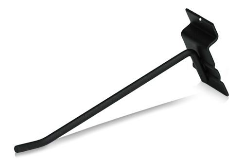 Black-lacquered single hook. The hook is designed to fit our garage interior with slotwall panels featuring an aluminum rail for suspension of accessories. Perfect for adding extra storage space in both garages and workshops.