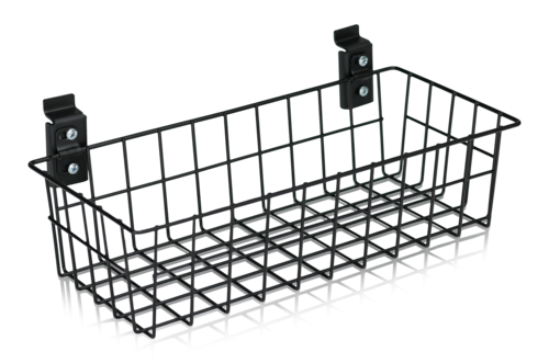 Black-lacquered wire basket. The basket is designed to fit our garage interior with slotwall panels featuring an aluminum rail for suspension of accessories. Perfect for adding extra storage space in both garages and workshops.