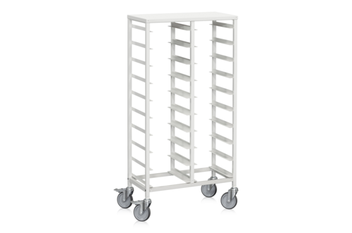 Tray trolley made of steel tubing, powder coated in white. The trolley holds up to 20 trays and is equipped with four wheels, two of which are lockable. Facilitates work in public environments such as restaurants, canteens, or cafés, making it easy to handle large quantities of dishes. Sturdy and durable, which is essential as the trolley is exposed to heavy daily use and external impact.
