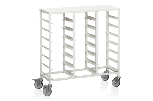 Tray trolley made of steel tubing, powder coated in white. The trolley holds up to 21 trays and is equipped with four wheels, two of which are lockable. Facilitates work in public environments such as restaurants, canteens, or cafés, making it easy to handle large quantities of dishes. Sturdy and durable, which is essential as the trolley is exposed to heavy daily use and external impact.