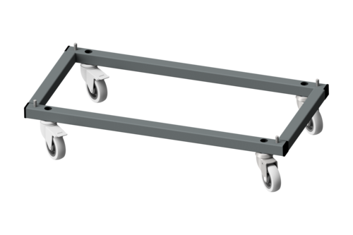 Fahrgestell für Computerschränke. Robuste, geschweißte Rohrkonstruktion mit vier 75-mm-Rädern, zwei davon mit Bremsen. Wird mit den beiliegenden Schrauben an der Unterseite des Schranks befestigt.