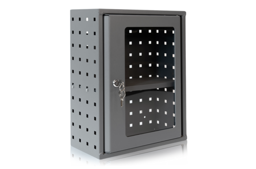 Kleiner, abschließbarer Aufbewahrungsschrank aus gelochtem Metall 1,5 mmmit einem beweglichen Regalboden.