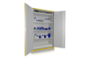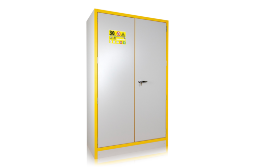 Chemikalienschrank mit Bodenwanne und drei beweglichen Fachböden. Der Schrank ist gemäß EN 14470-1 30 Minuten feuergetestet. Ausgestattet mit selbstschließenden Türen, die außerdem festgestellt werden können und automatisch bei einem Temperaturanstieg von 50°C schließen. Die Türen schließen separat. Anschlussstutzen (Ø100 mm) für Zu- und Abluft.