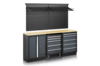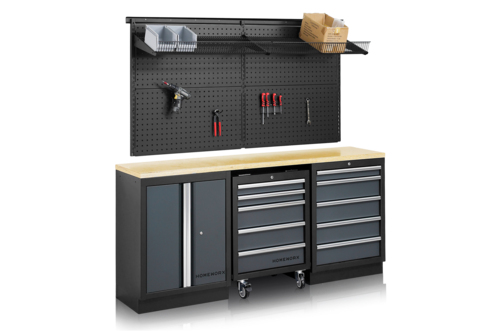 Die Garagenausstattung Homeworx Komplett 2 besteht aus zwei verschiedenen Unterschränken – einem mit Schränken und einem mit Schubladen –, einem Schubladenblock auf Rollen, einer Arbeitsplatte aus Holzfaser, vier Lochplatten und zwei Drahtböden. Die Schubladen in den Unterschränken und Schubladen verfügen über kugelgelagerte Auszüge. Die Arbeitsplatte befindet sich in einer ergonomischen Höhe von 95 cm.