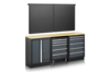 Die Homeworx Complete 3 Garagenausstattung besteht aus zwei verschiedenen Unterschränken, einem mit Schränken und einem mit Schubladen, einem Schubladenblock auf Rollen, einer Arbeitsplatte aus Holzfaser und vier Lochplatten. Die Schubladen in den Unterschränken und Schubladen verfügen über kugelgelagerte Auszüge. Die Arbeitsplatte befindet sich in einer ergonomischen Höhe von 95 cm.