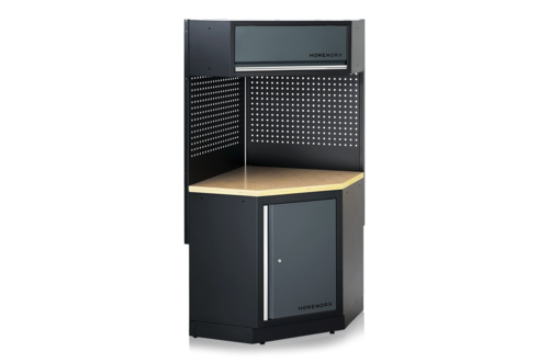 Eckmodul, passend zu unserer übrigen Garageneinrichtung. Das Eckmodul besteht aus einem Aufsatzschrank, zwei Lochplatten, einer Deckplatte aus 38 mm starkem Sperrholz und einem Unterschrank. Der Unterschrank verfügt über einen herausnehmbaren Einlegeboden und eine abschließbare Tür mit zwei Schlüsseln. Der obere Schrank lässt sich per Gasdruckfeder öffnen. Diese Komplettlösung beinhaltet vier Stützen zum Aufhängen von Paneelen und Wandschränken. Die perfekte Ergänzung, um den Stauraum in der Garage zu erweitern und den Eckraum optimal zu nutzen.