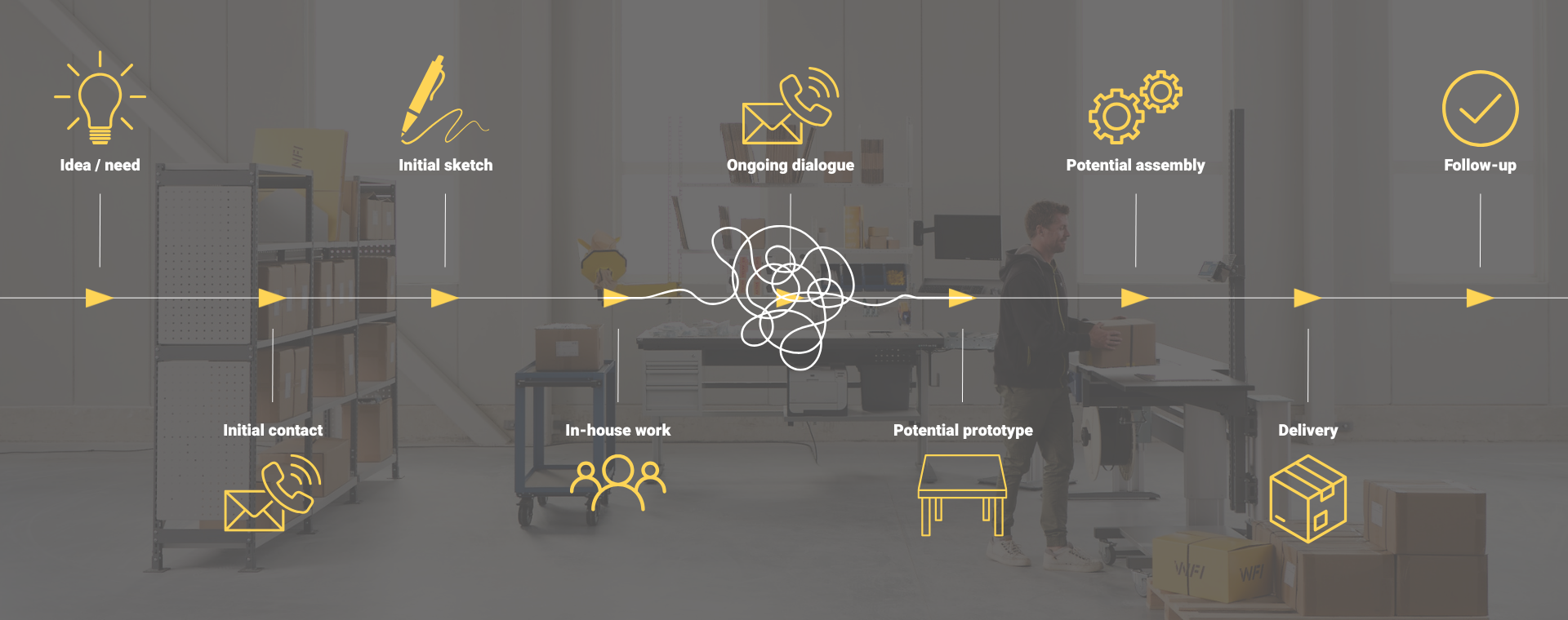 Nach Ihrer Angebotsfreigabe wird die Bearbeitung intern bei uns fortgesetzt. Verschiedene Abteilungen sind daran beteiligt und tragen maßgeblich zum reibungslosen Ablauf des Projekts bei. Die Projektabteilung entwickelt die einzelnen Elemente, unsere Designer erstellen alle Zeichnungen, der Einkauf sucht die passenden Lieferanten für das Projekt und das Lager bereitet die Testmontage vor.