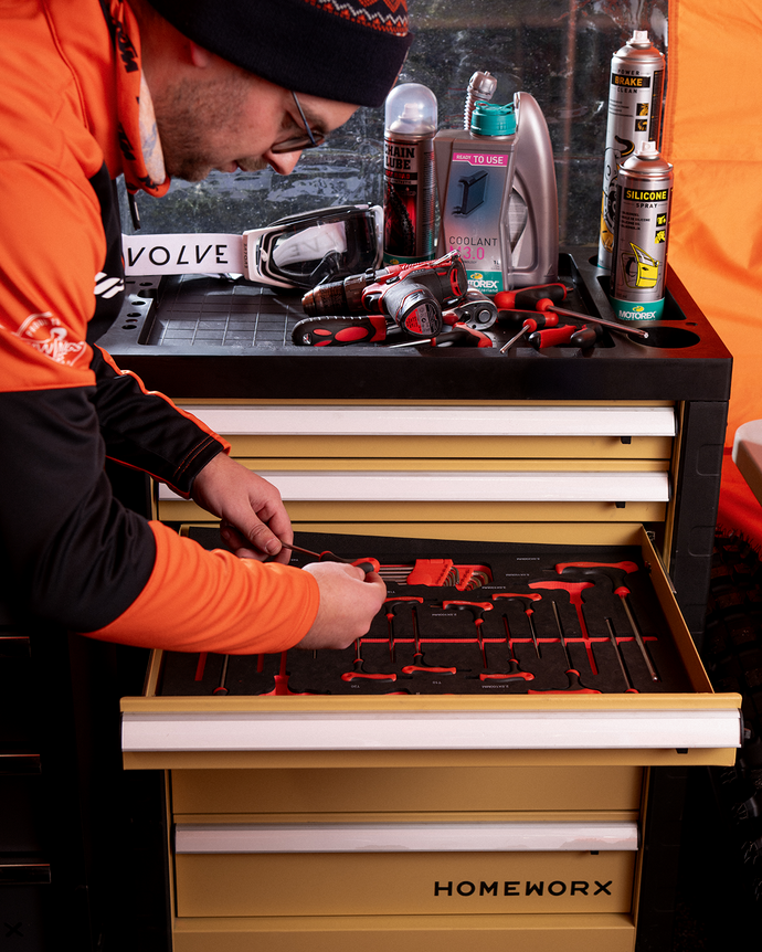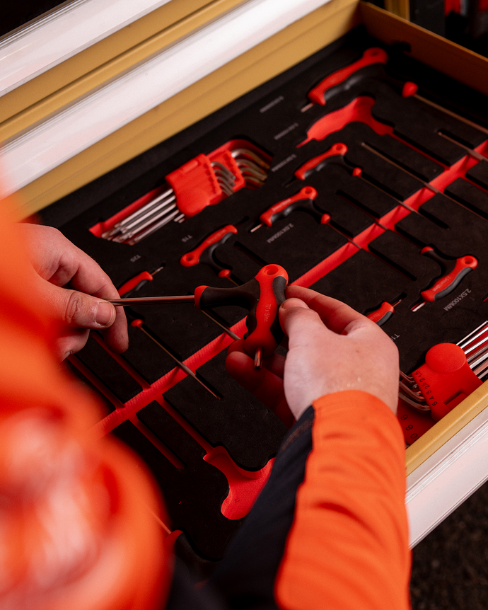 – Mein Lieblingswerkzeug ist der Torx-Schlüssel mit T-Griff, und er liegt immer am selben Platz. Das sorgt dafür, dass alles reibungslos läuft, wenn es auf die Minute ankommt. Sich auf die Ausrüstung verlassen zu können, egal ob Motorrad oder Werkzeugwagen, ist Voraussetzung, um das Ziel zu erreichen, resümiert Simon.