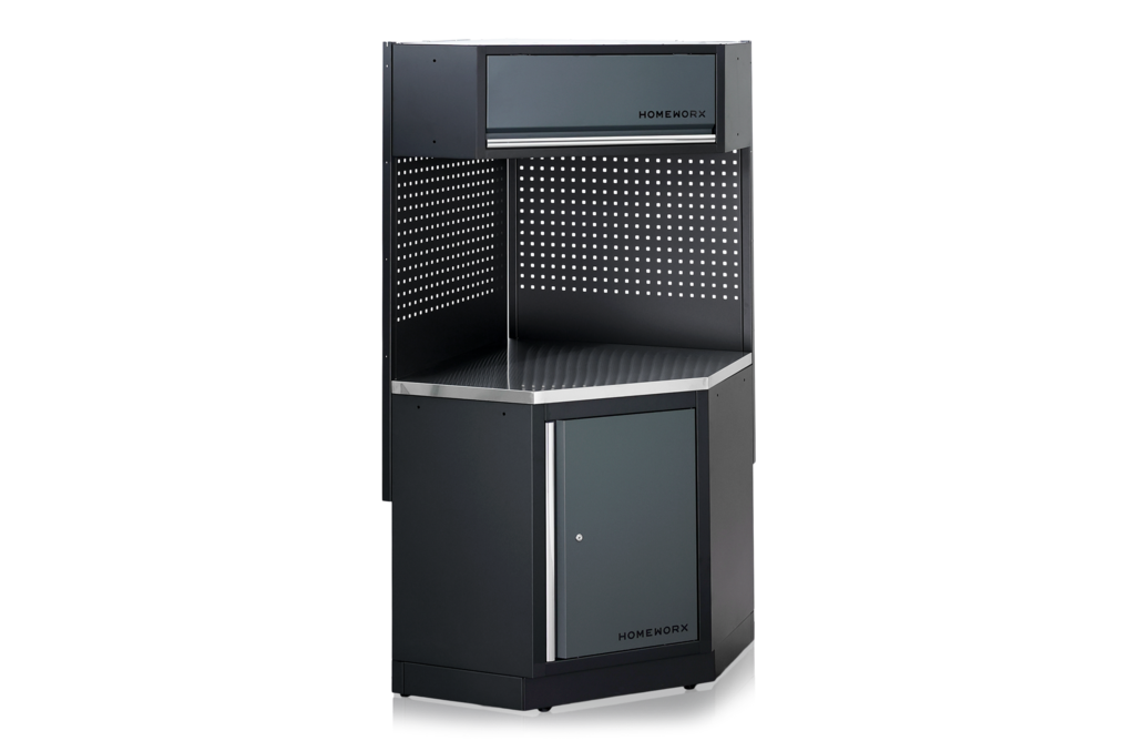 Um unser Sortiment an Garagenmöbeln zu ergänzen und mehr Gestaltungsmöglichkeiten zu schaffen, präsentieren wir ein neues Eckmodul. Es besteht aus einem Aufsatzschrank, zwei perforierten Paneelen, einer Deckplatte aus Edelstahl oder Sperrholz und einem Unterschrank. Der Unterschrank verfügt über einen herausnehmbaren Einlegeboden und eine abschließbare Tür mit zwei Schlüsseln. Der Aufsatzschrank lässt sich per Gasdruckfeder öffnen. Die perfekte Ergänzung, um den Stauraum in der Garage zu erweitern und den Eckraum optimal zu nutzen.