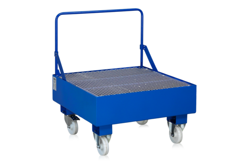 Auffangwanne mit Rollen für 2 Fässer. Auffangkapazität von 240 l. Verhindert das Kontaminieren von Flächen mit umweltgefährdenden Flüssigkeiten durch Auffagen in der Wanne. Robuste Stahlblechkonstruktion, für maschinelle Handhabung geeingnet. Die Auffangwanne ist pulverlackiert und mit einer galvanisierten Streckmetallauflage ausgestattet. Die Auffangwanne ist mit einem Handgriff und 2 festen (ungebremsten) und 2 schwenkbaren (mit Sperren) 160 mm Rollen ausgestattet.